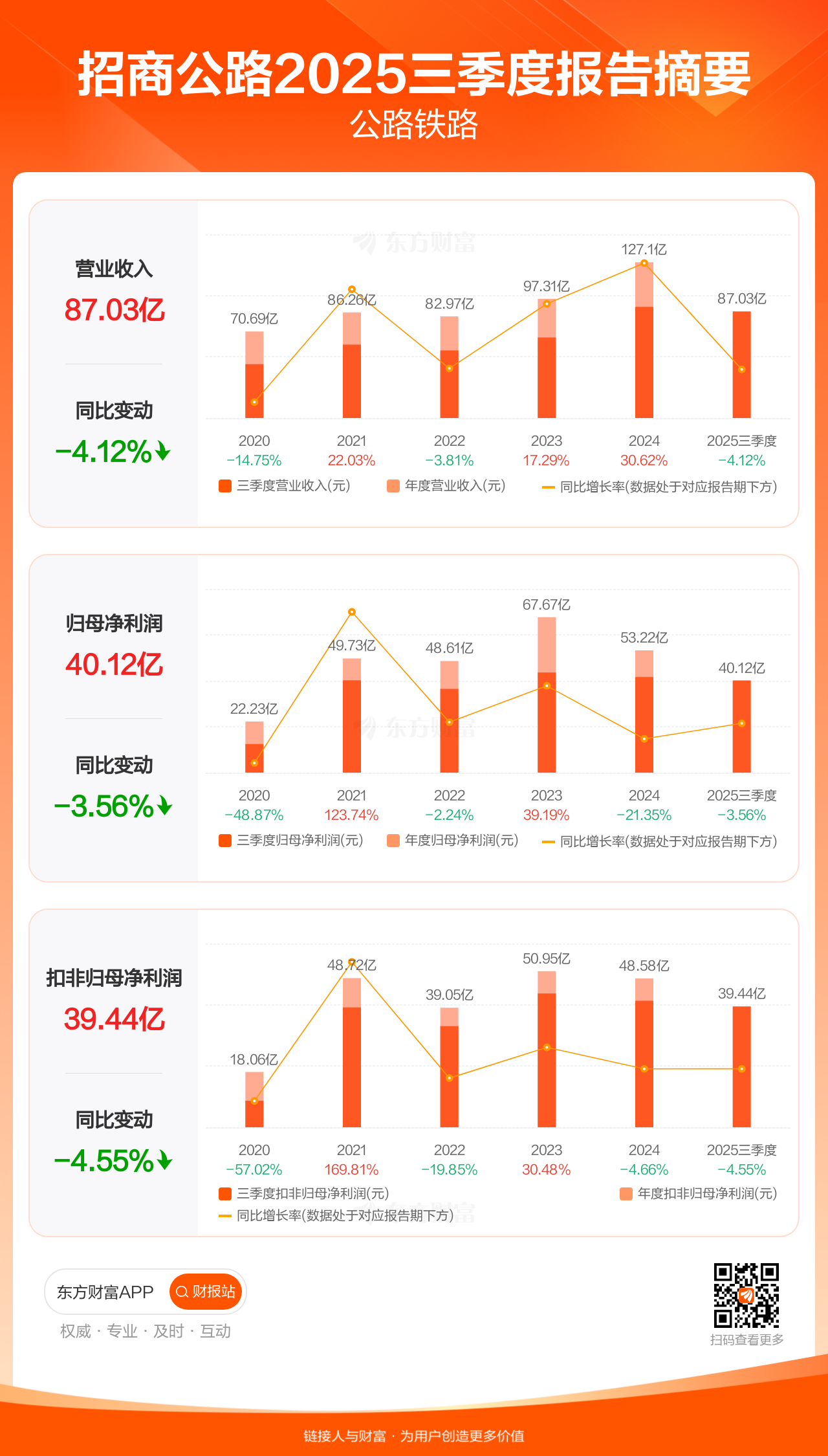 图解财报:招商公路前三季归母净利润40.12亿元,同比减少3.56%