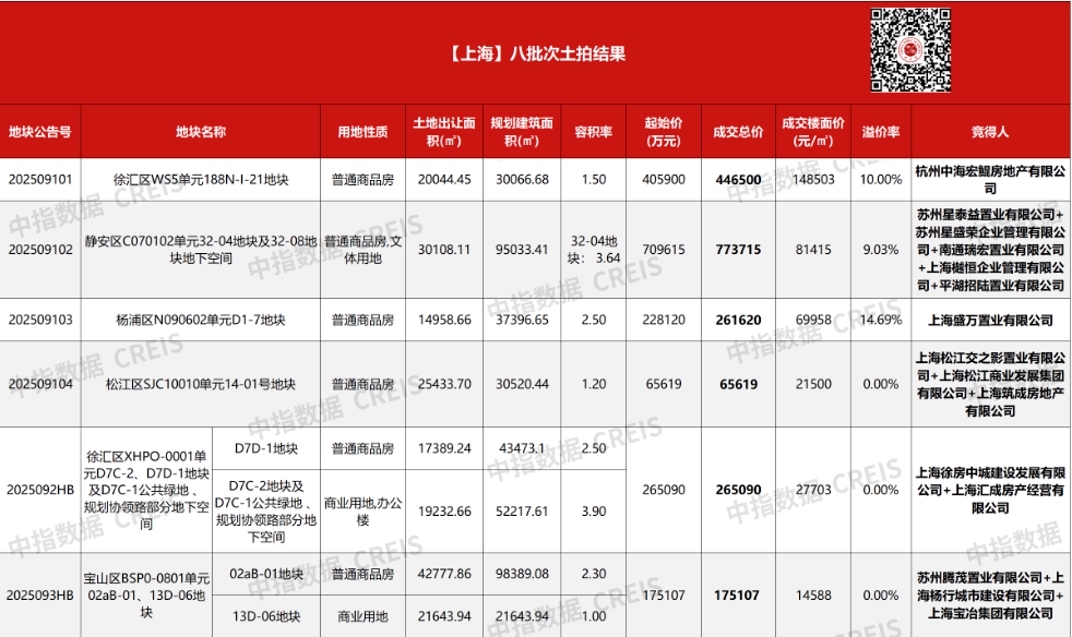 10月20日,上海2025年第八批次土地拍卖举行现场交易活动。市场关注较高的徐汇、静安两幅地块均溢价成交。其中,招商蛇口联合体斩获静安区C070102单元32-04地块及32-08地块地下空间,而徐汇区WS5单元188N-I-21地块最终被中海收入囊中,成交楼板价约148503元/平方米创出上海徐汇滨江板块成交楼板价的新纪录。