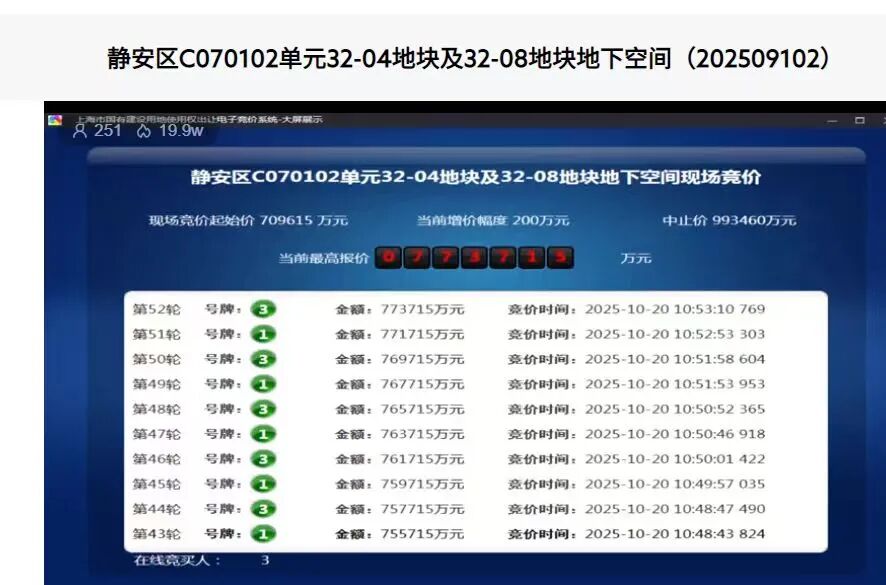 静安区C070102单元32-04地块及32-08地块地下空间的起始价在此次土拍6幅地块中最高,为70.9615亿元。该地块共吸引了3位竞买人参与竞拍,竞争主要集中在1号竞买人与3号竞买人之间,且3号竞买人多次在1号竞买人报价后随即跟进抬高报价,展现出对该地块志在必得之势。经过52轮竞价,最终3号竞买人——由招商蛇口、越秀地产、星狮、南通瑞宏置业组成的联合体以77.3715亿元成功摘得该地块,溢价率约9.03%。