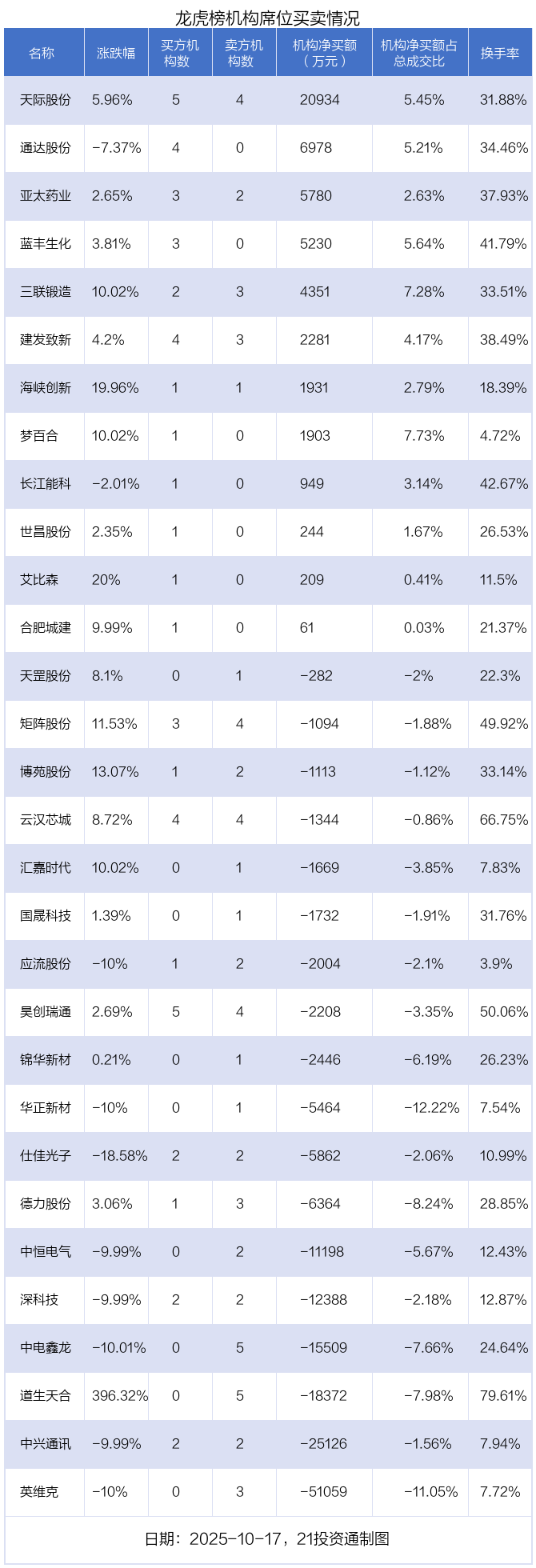 10月17日,30只个股龙虎榜出现了机构的身影,机构合计净卖出11.44亿元。具体来看,机构净买入12股,净卖出18股。