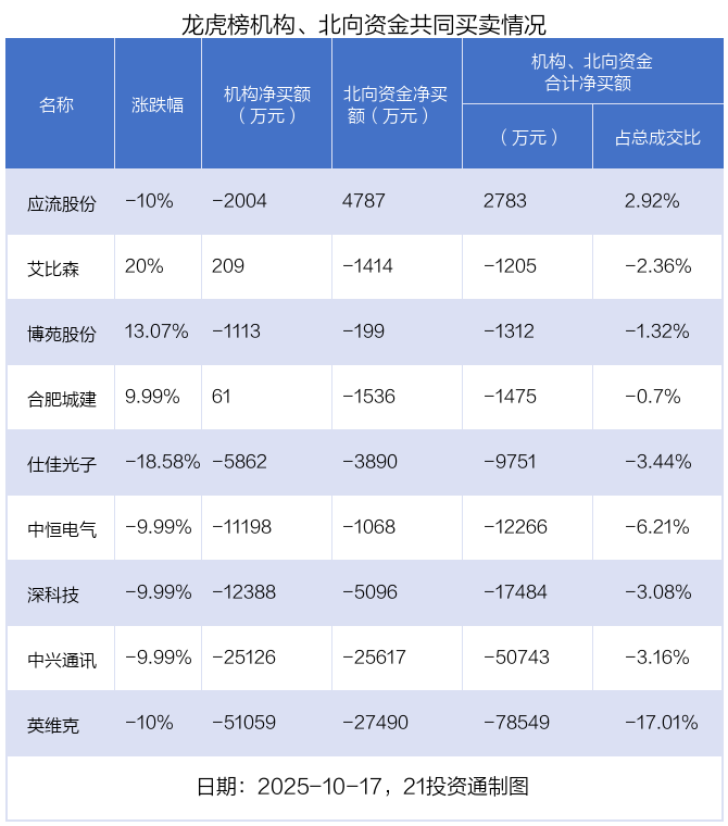 而龙虎榜中资金净流出最多的是英维克(002837.SZ),被净卖出为8.43亿元,占总成交金额的18.26%。英维克收盘下跌10%,换手率为7.72%。