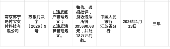 蓝鲸新闻1月22日讯,近日,中国人民银行江苏省分行发布了罚单,剑指南京苏宁易付宝支付科技有限公司。
