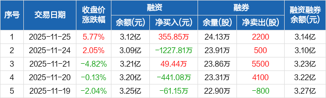 融资方面,当日融资买入3117.22万元,融资偿还2761.37万元,融资净买入355.85万元。融券方面,融券卖出2700股,融券偿还500股,融券余量24.13万股,融券余额190.11万元。融资融券余额合计3.14亿元。