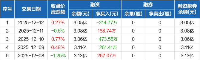 融资方面,当日融资买入324.61万元,融资偿还539.38万元,融资净偿还214.77万元。融券方面,融券卖出0股,融券偿还0股,融券余量0股,融券余额0元。融资融券余额合计3.05亿元。