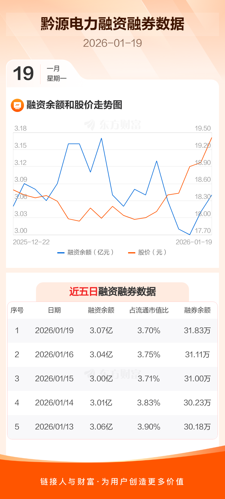 交易所最新数据显示,黔源电力于2026年1月19日获融资买入1476.74万元,融资偿还1135.89万元,当日融资净买入340.85万元。目前,该股融资余额3.07亿,占流通市值比例为3.70%。