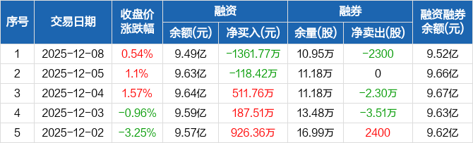 宁波华翔:融资净偿还1361.77万元,融资余额9.49亿元(12-08)