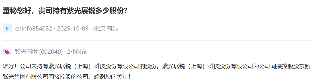 上证报中国证券网讯紫光国微13日在互动平台上回复投资者提问时表示,公司未持有紫光展锐(上海)科技股份有限公司的股份。紫光展锐(上海)科技股份有限公司为公司间接控股股东新紫光集团有限公司间接控股的公司。