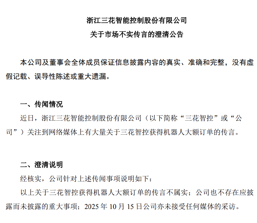隔夜,三花智控发布《关于市场不实传言的澄清公告》表示,关注到网络媒体上有大量关于三花智控获得机器人大额订单的传言。经核实,公司针对上述传闻事项说明如下:以上关于三花智控获得机器人大额订单的传言不属实;公司也不存在应披露而未披露的重大事项。