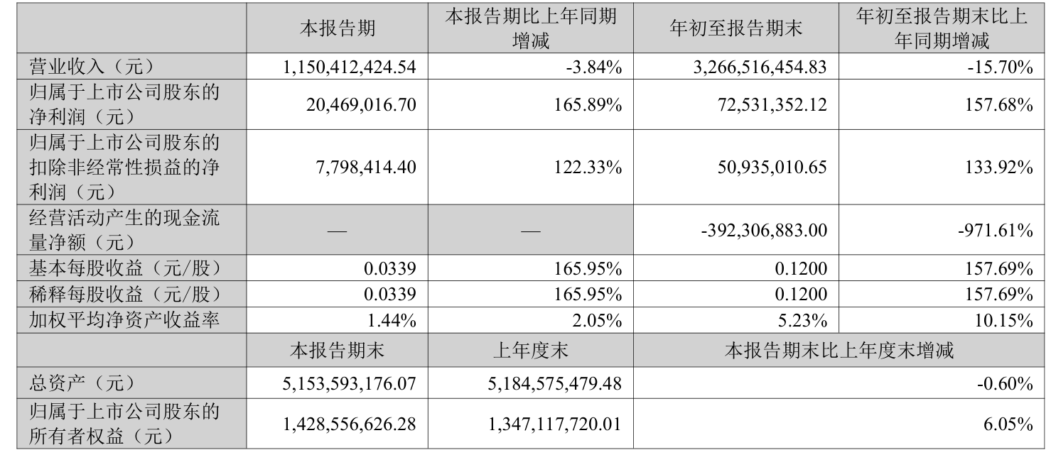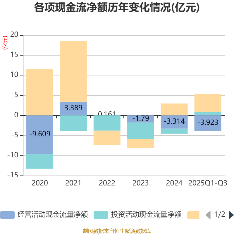 2025年前三季度,公司经营活动现金流净额为-3.92亿元,同比减少4.37亿元;筹资活动现金流净额4.45亿元,同比增加5.1亿元;投资活动现金流净额8588.83万元,上年同期为-7540.3万元。