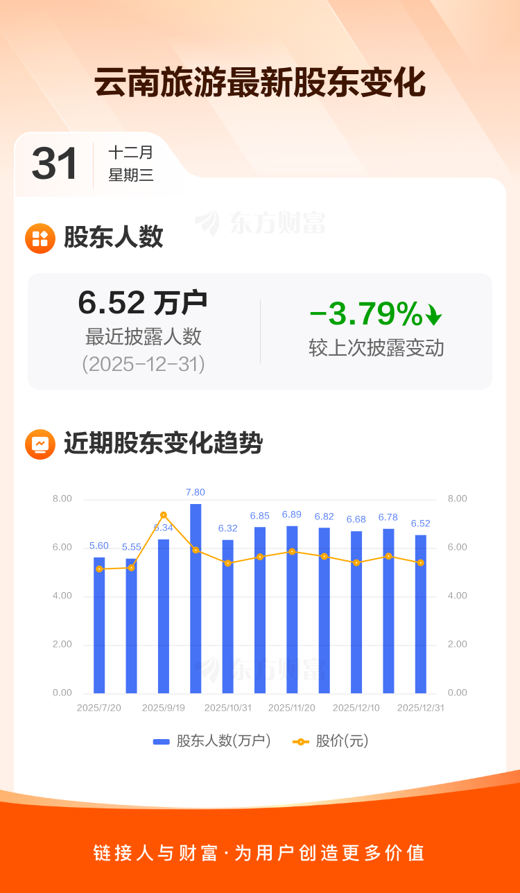 云南旅游:截至12月31日最新股东户数6.52万户,较上期减少3.79%