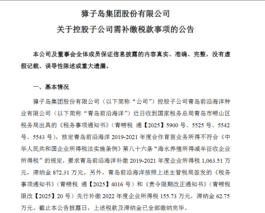 据公告披露,青岛前沿海洋收到国家税务总局青岛市崂山区税务局发出的多份《税务事项通知书》及《责令限期改正通知书》。税务部门认定,该公司2019-2021年间的合作育苗业务不符合《中华人民共和国企业所得税法实施条例》第八十六条中“海水养殖所得减半征收企业所得税”的规定,需补缴企业所得税1063.51万元,并缴纳滞纳金872.31万元。此外,青岛前沿海洋已按税务机关要求,先行补缴2022年度企业所得税155.73万元及滞纳金62.75万元。