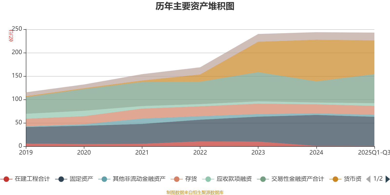资产重大变化方面,截至2025年三季度末,公司交易性金融资产合计较上年末增加37.97%,占公司总资产比重上升7.11个百分点;货币资金较上年末减少19.08%,占公司总资产比重下降6.87个百分点;固定资产较上年末减少5.45%,占公司总资产比重下降1.39个百分点;应收款项融资较上年末增加48.69%,占公司总资产比重上升0.79个百分点。