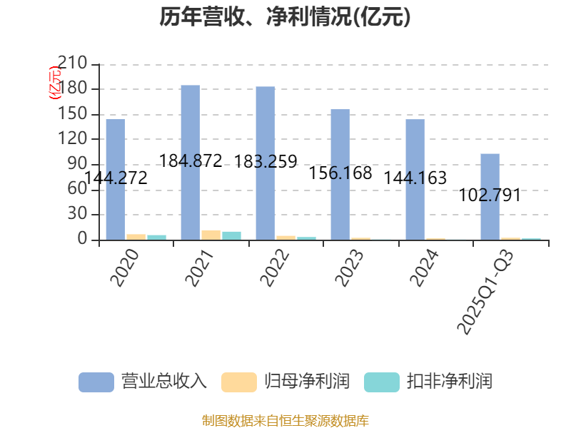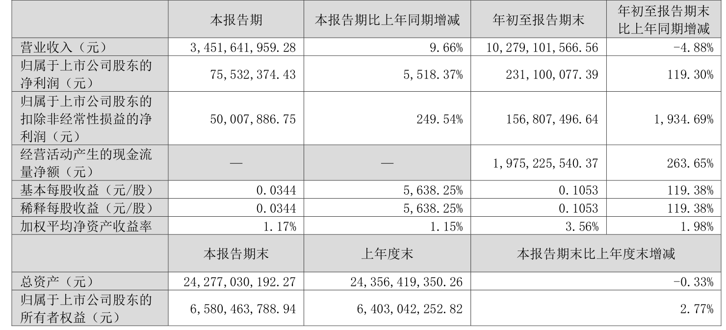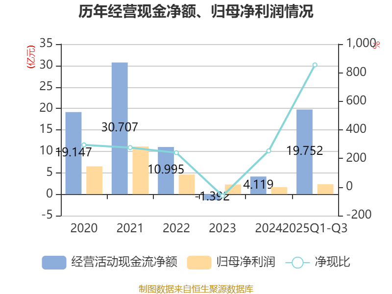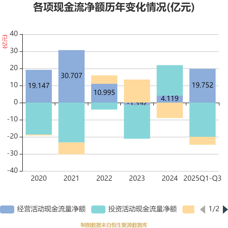 2025年前三季度,公司经营活动现金流净额为19.75亿元,同比增长263.65%;筹资活动现金流净额-4.63亿元,同比增加2367.18万元;投资活动现金流净额-20.02亿元,上年同期为10.73亿元。