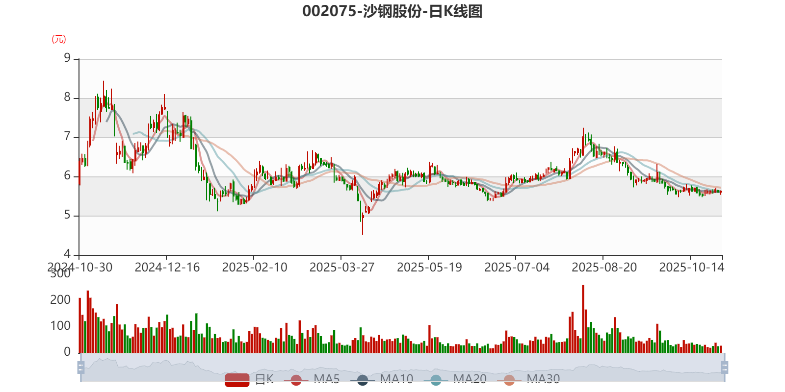 中证智能财讯沙钢股份(002075)10月30日披露2025年第三季度报告。前三季度公司实现营业总收入102.79亿元,同比下降4.88%;归母净利润2.31亿元,同比增长119.30%;扣非净利润1.57亿元,同比扭亏;经营活动产生的现金流量净额为19.75亿元,同比增长263.65%;报告期内,沙钢股份基本每股收益为0.1053元,加权平均净资产收益率为3.56%。