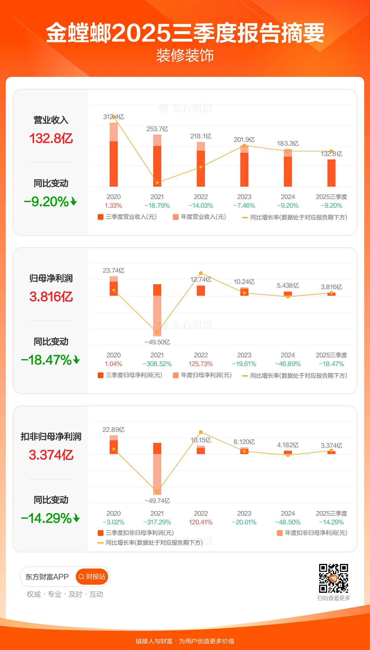 金螳螂10月30日发布2025年三季报显示,公司前三季实现营业收入132.75亿元,同比下滑9.20%;归母净利润3.82亿元,同比下滑18.47%;扣非归母净利润3.37亿元,同比下滑14.29%。