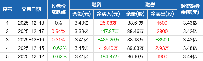 金螳螂融资融券信息显示,2025年12月18日融资净买入25.08万元;融资余额3.4亿元,较前一日增加0.07%