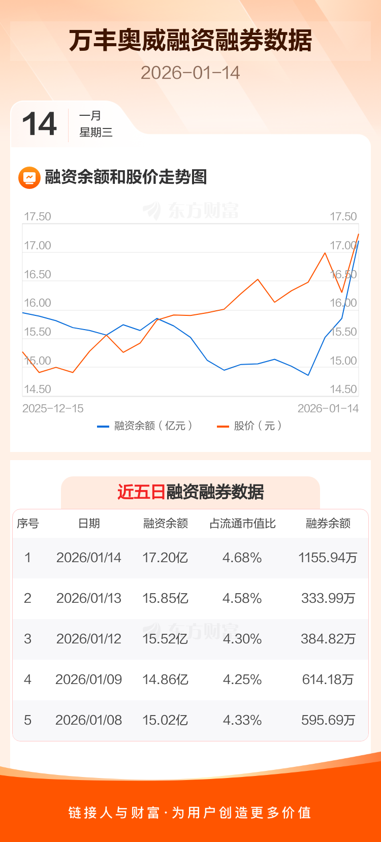 交易所最新数据显示,万丰奥威于2026年1月14日获融资买入4.38亿元,融资偿还3.03亿元,当日融资净买入1.35亿元。目前,该股融资余额17.20亿,占流通市值比例为4.68%。