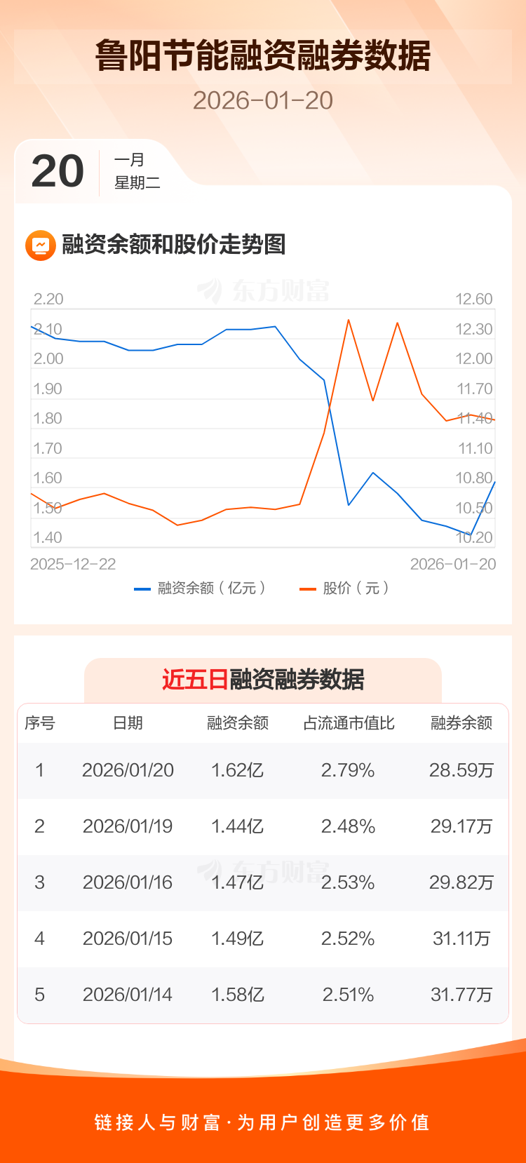 交易所最新数据显示,鲁阳节能于2026年1月20日获融资买入2696.16万元,融资偿还918.12万元,当日融资净买入1778.03万元。目前,该股融资余额1.62亿,占流通市值比例为2.79%。