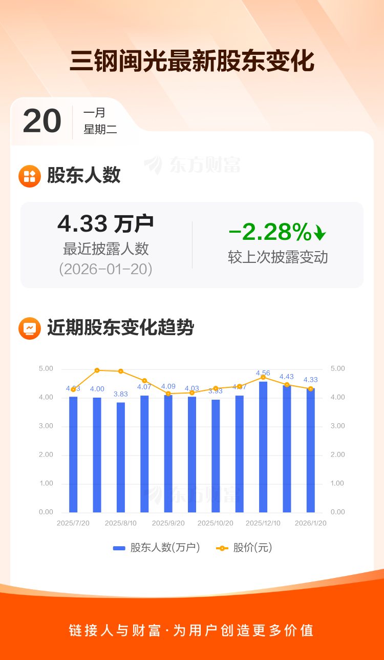 三钢闽光最新披露数据显示,截至1月20日公司股东户数为4.33万户,较上期(2025年12月20日)减少1010户,降幅为2.28%。户均持有流通股数量由上期的5.48万股上升至5.61万股,户均持股金额由上期的24.39万元减少至24.18万元。