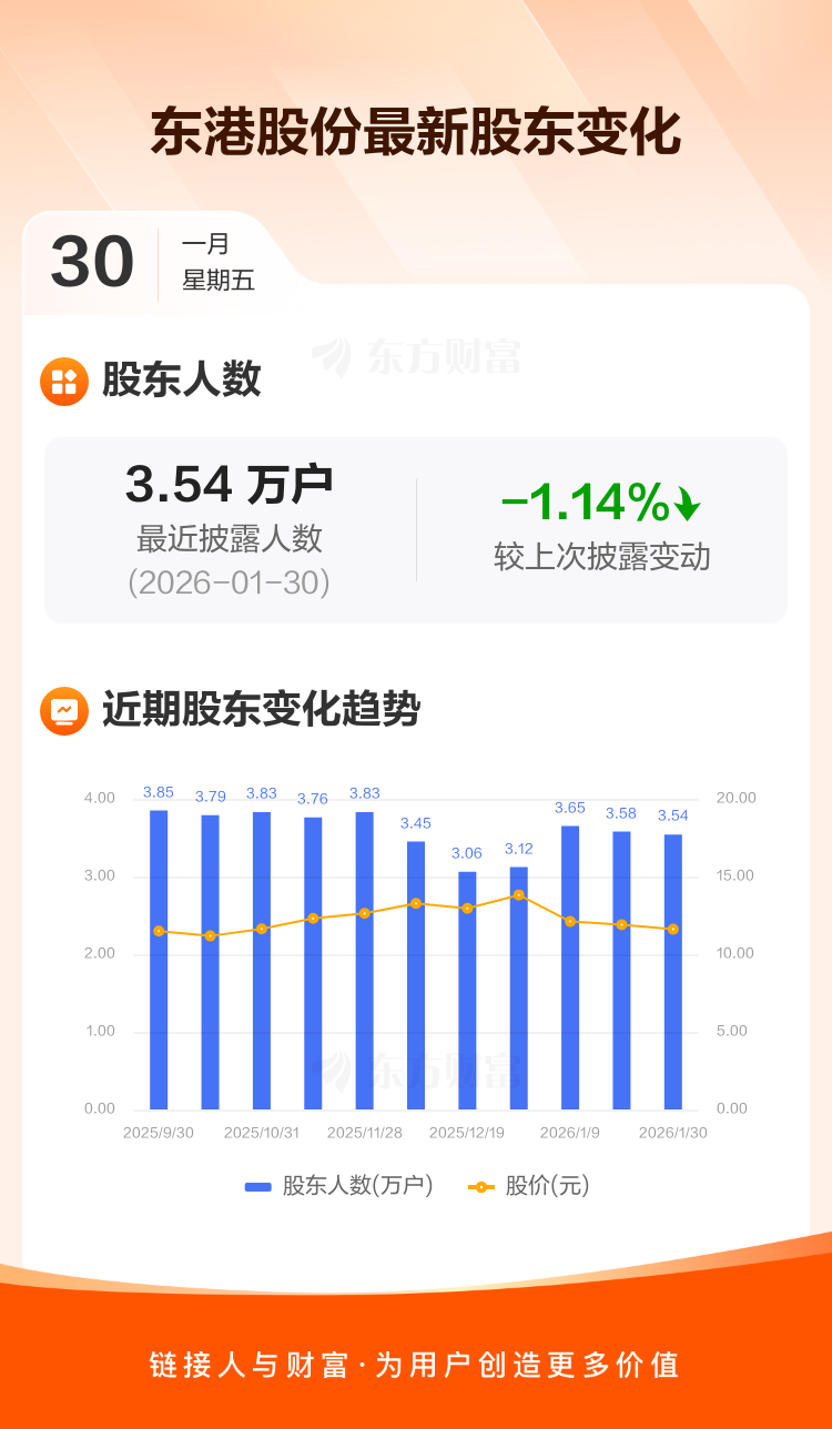 东港股份最新披露数据显示,截至1月30日公司股东户数为3.54万户,较上期(2026年1月20日)减少408户,降幅为1.14%。户均持有流通股数量由上期的1.46万股上升至1.48万股,户均持股金额由上期的17.39万元减少至17.15万元。