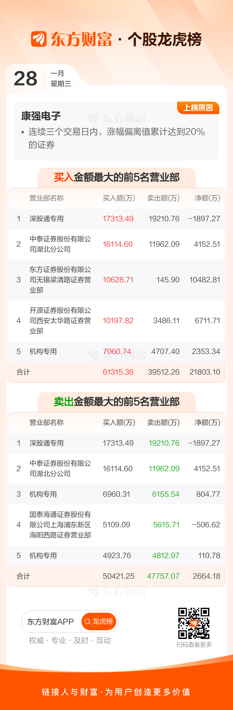 康强电子(002119)龙虎榜数据(01-28)