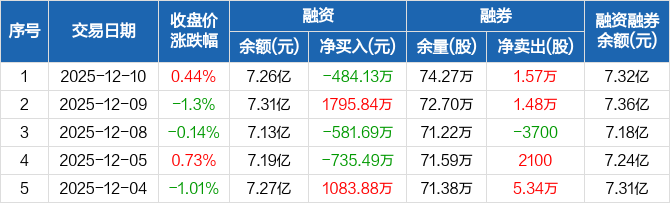 韵达股份:融资净偿还484.13万元,融资余额7.26亿元(12-10)