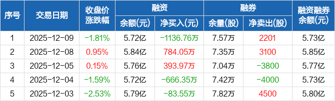湘潭电化:融资净偿还1136.76万元,融资余额5.72亿元(12-09)