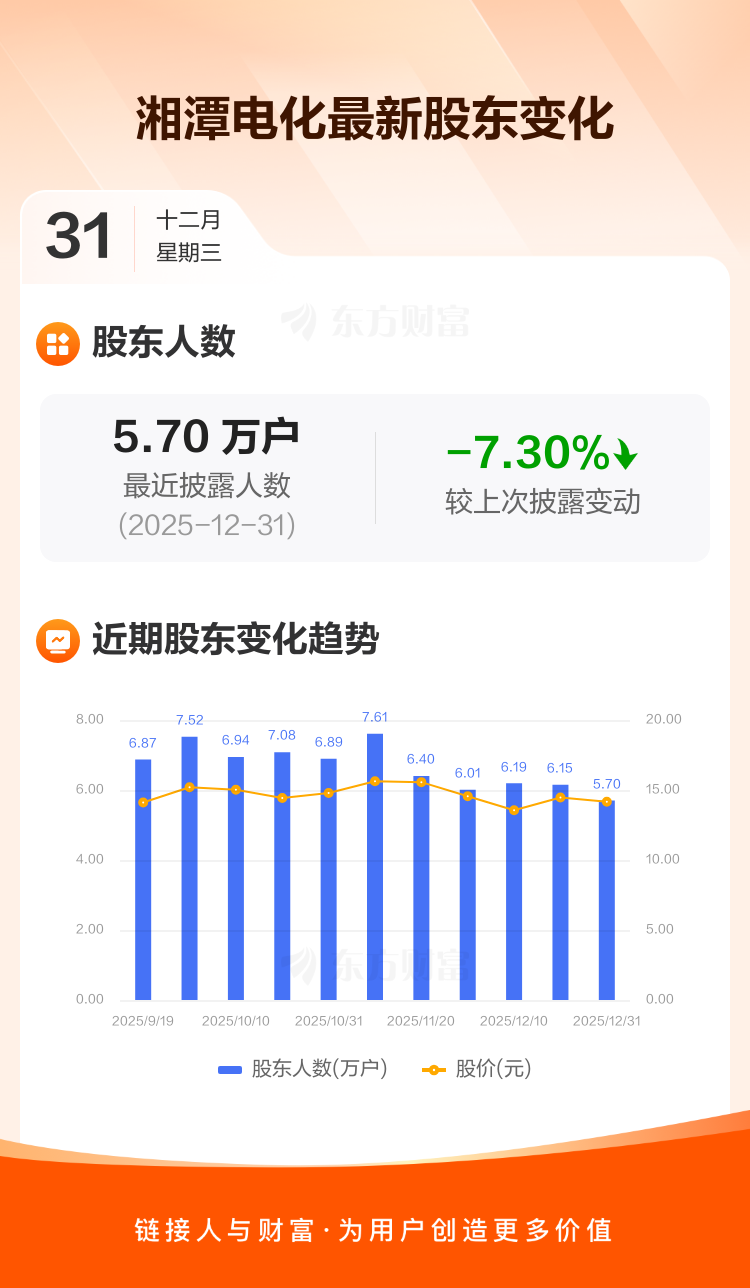 湘潭电化最新披露数据显示,截至12月31日公司股东户数为5.70万户,较上期(2025年12月19日)减少4487户,降幅为7.30%。户均持有流通股数量由上期的1.02万股上升至1.10万股,户均持股金额由上期的14.81万元增加至15.64万元。