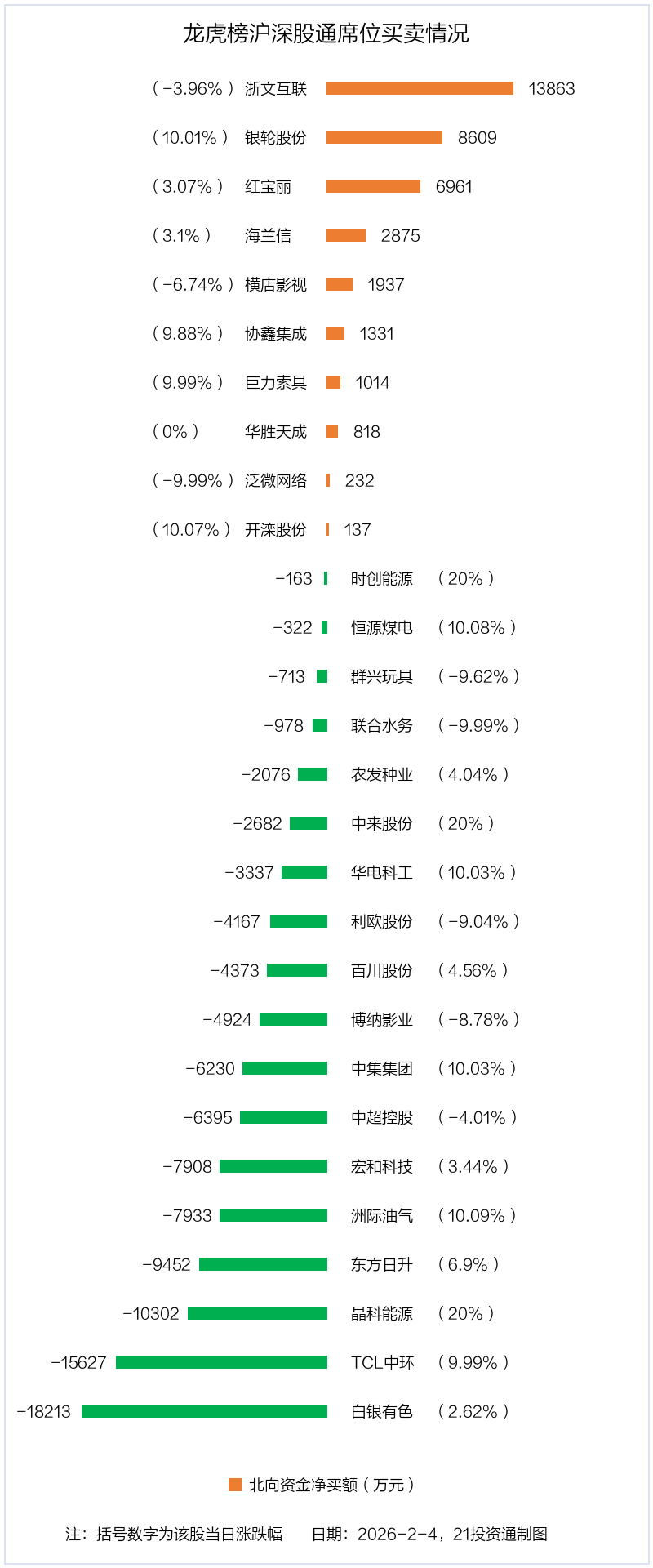 2月4日,北向资金参与龙虎榜中的个股共有28只,合计净卖出6.8亿元。其中沪股通净买入5 股,净卖出9 股,合计净卖出3.42亿元;深股通净买入5 股,净卖出9 股,合计净卖出3.38亿元。