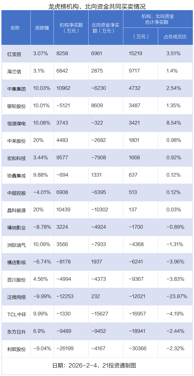 值得注意的是,机构和北向资金共同净买入了红宝丽、海兰信等2股;共同净卖出了利欧股份、百川股份、东方日升、TCL中环等4股;在银轮股份,横店影视,协鑫集成,泛微网络,恒源煤电,中来股份,博纳影业,中集集团,中超控股,宏和科技,洲际油气,晶科能源上出现分歧,机构净卖出银轮股份5121.45万元,北向资金净买入8608.72万元;机构净卖出横店影视8177.75万元,北向资金净买入1936.95万元;机构净卖出协鑫集成694.27万元,北向资金净买入1331.47万元;机构净卖出泛微网络1.23亿元,北向资金净买入231.83万元;机构净买入恒源煤电3743.12万元,北向资金净卖出322.24万元;机构净买入中来股份4483.37万元,北向资金净卖出2682.49万元;机构净买入博纳影业3224.15万元,北向资金净卖出4924.48万元;机构净买入中集集团1.1亿元,北向资金净卖出6230.43万元;机构净买入中超控股6907.86万元,北向资金净卖出6395.04万元;机构净买入宏和科技9576.65万元,北向资金净卖出7908.5万元;机构净买入洲际油气3565.89万元,北向资金净卖出7933.46万元;机构净买入晶科能源1.04亿元,北向资金净卖出1.03亿元。