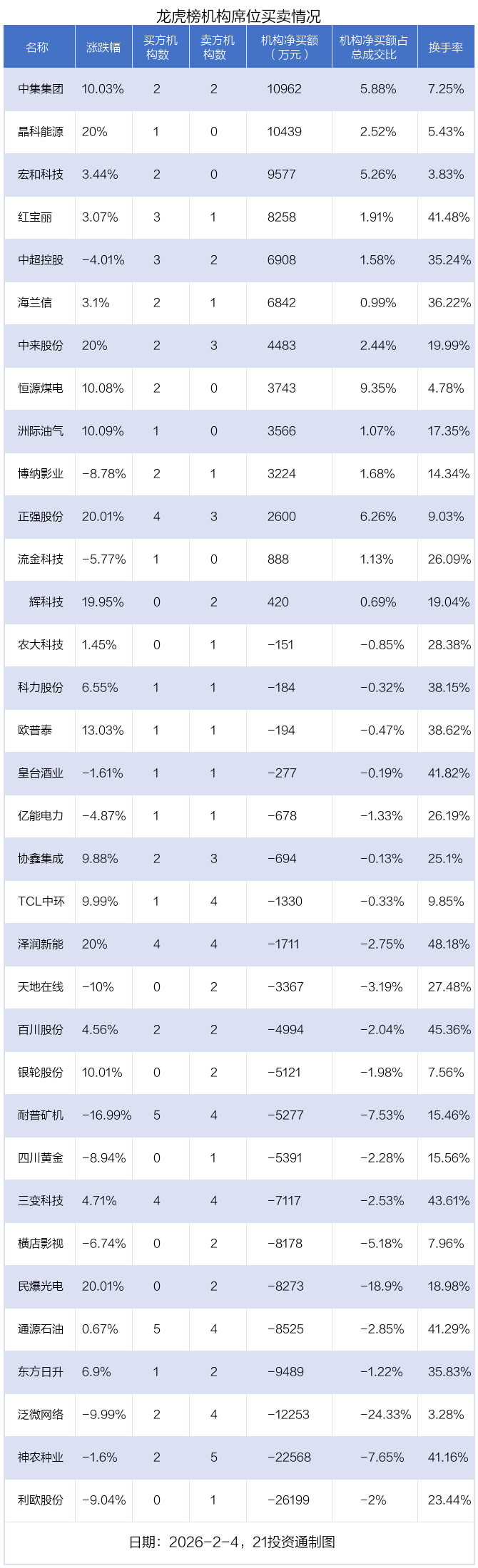 2月4日,34只个股龙虎榜出现了机构的身影,机构合计净卖出6.01亿元。具体来看,机构净买入13股,净卖出21股。