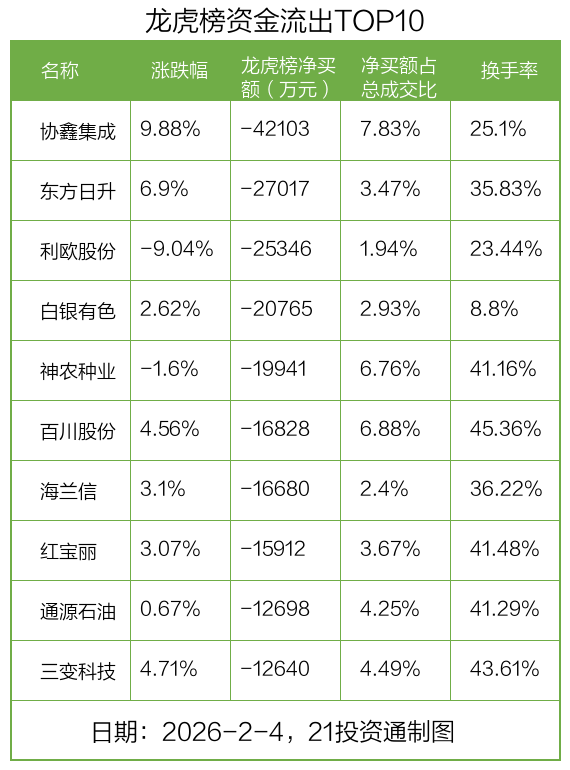 而龙虎榜中资金净流出最多的是协鑫集成(002506.SZ),被净卖出为4.21亿元,占总成交金额的7.83%。协鑫集成收盘上涨9.88%,换手率为25.1%。