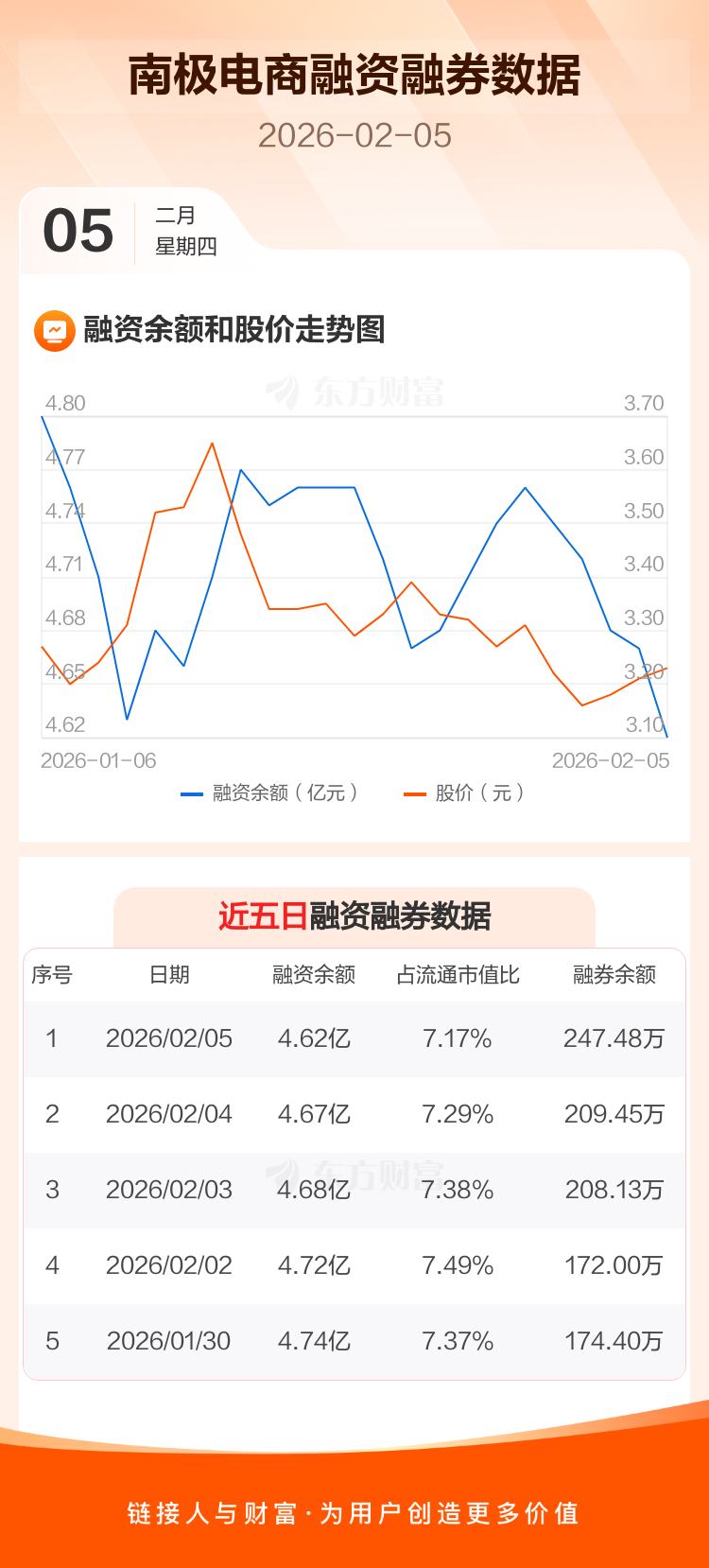 交易所最新数据显示,南极电商于2026年2月5日获融资买入773.67万元,融资偿还1288.48万元,当日融资净偿还514.8万元。目前,该股融资余额4.62亿,占流通市值比例为7.17%。