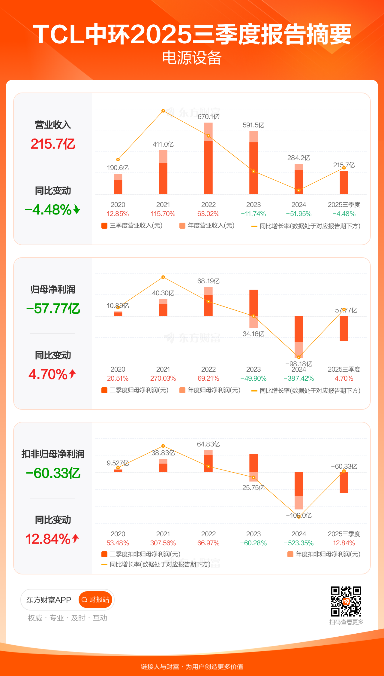 TCL中环10月29日发布2025年三季报显示,公司前三季实现营业收入215.72亿元,同比下滑4.48%;归母净利润-57.77亿元;扣非归母净利润-60.33亿元。