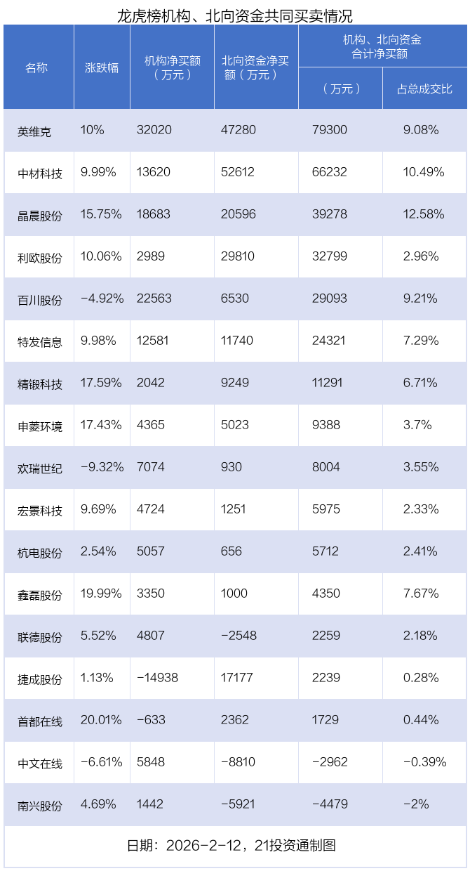 值得注意的是,机构和北向资金共同净买入了中材科技、英维克、利欧股份、晶晨股份、特发信息、精锻科技、百川股份、申菱环境、宏景科技、鑫磊股份、欢瑞世纪、杭电股份等12股;在捷成股份,首都在线,联德股份,南兴股份,中文在线上出现分歧,机构净卖出捷成股份1.49亿元,北向资金净买入1.72亿元;机构净卖出首都在线633.08万元,北向资金净买入2361.76万元;机构净买入联德股份4806.79万元,北向资金净卖出2548.19万元;机构净买入南兴股份1441.63万元,北向资金净卖出5920.74万元;机构净买入中文在线5848.4万元,北向资金净卖出8810.06万元。