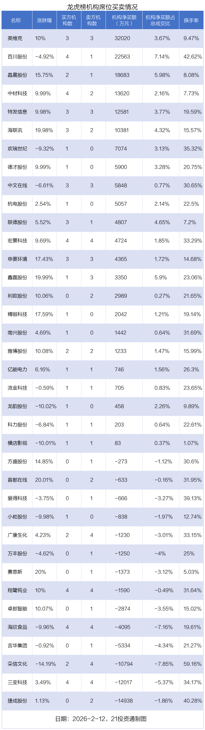 2月12日,37只个股龙虎榜出现了机构的身影,机构合计净买入10.3亿元。具体来看,机构净买入23股,净卖出14股。