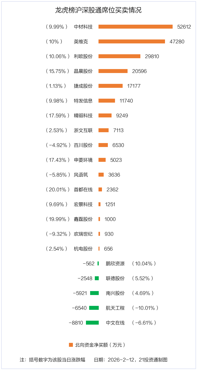 2月12日,北向资金参与龙虎榜中的个股共有21只,合计净买入19.26亿元。其中沪股通净买入4 股,净卖出3 股,合计净买入2.24亿元;深股通净买入12 股,净卖出2 股,合计净买入17.02亿元。