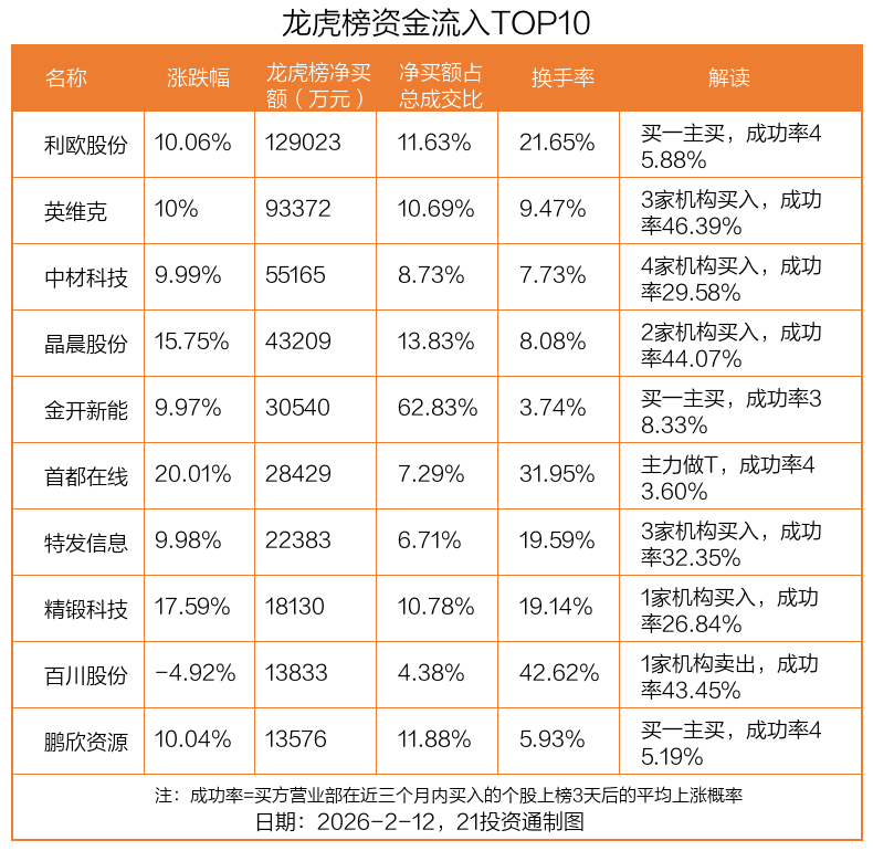 2月12日,上证指数上涨0.05%,深证成指上涨0.86%,创业板指上涨1.32%。盘后龙虎榜数据显示,共有54只个股因当日异动登上龙虎榜,资金净流入最多的是利欧股份(002131.SZ),达12.9亿元。