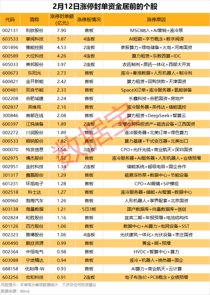 据证券时报·数据宝统计,以所属行业来看,涨停股数量居前的行业为机械设备、电力设备、公用事业,分别有12股、8股、5股。从所属概念来看,多只算力租赁、液冷服务器概念股涨停。