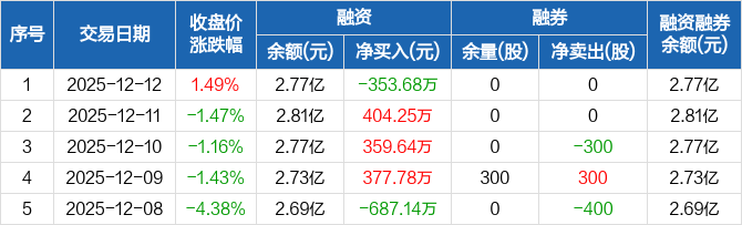 恒星科技:融资净偿还353.68万元,融资余额2.77亿元(12-12)