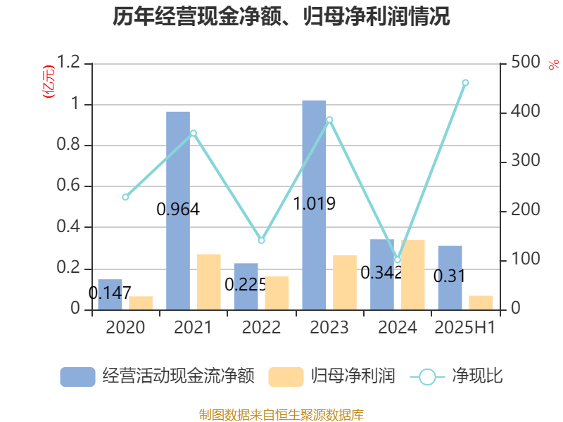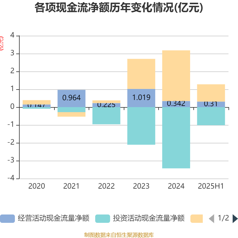 2025年上半年,公司经营活动现金流净额为3095.83万元,同比增长60.92%;筹资活动现金流净额9670.69万元,同比减少1.69亿元;投资活动现金流净额-1.01亿元,上年同期为-2.68亿元。