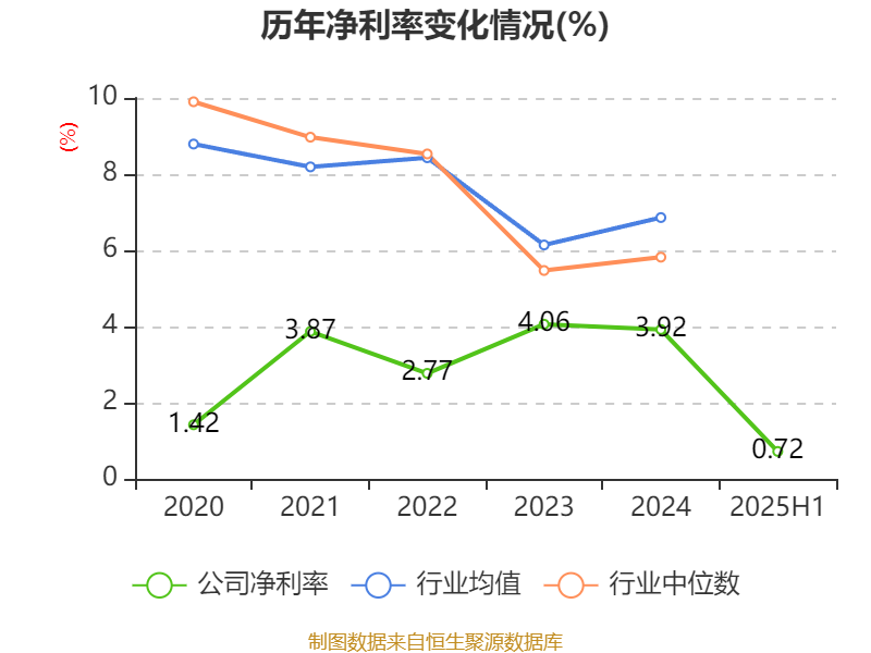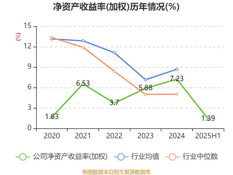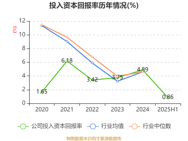盈利能力方面, 2025年上半年公司加权平均净资产收益率为1.39%,同比下降3.09个百分点。公司2025年上半年投入资本回报率为0.86%,较上年同期下降2.01个百分点。