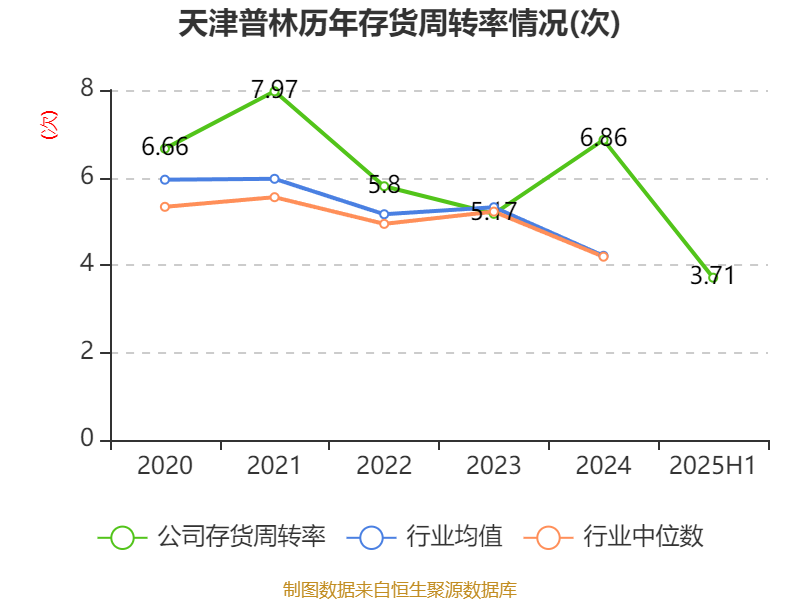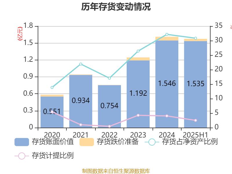 从存货变动来看,截至2025年上半年末,公司存货账面价值为1.53亿元,占净资产的30.82%,较上年末减少109.76万元。其中,存货跌价准备为392.15万元,计提比例为2.49%。
