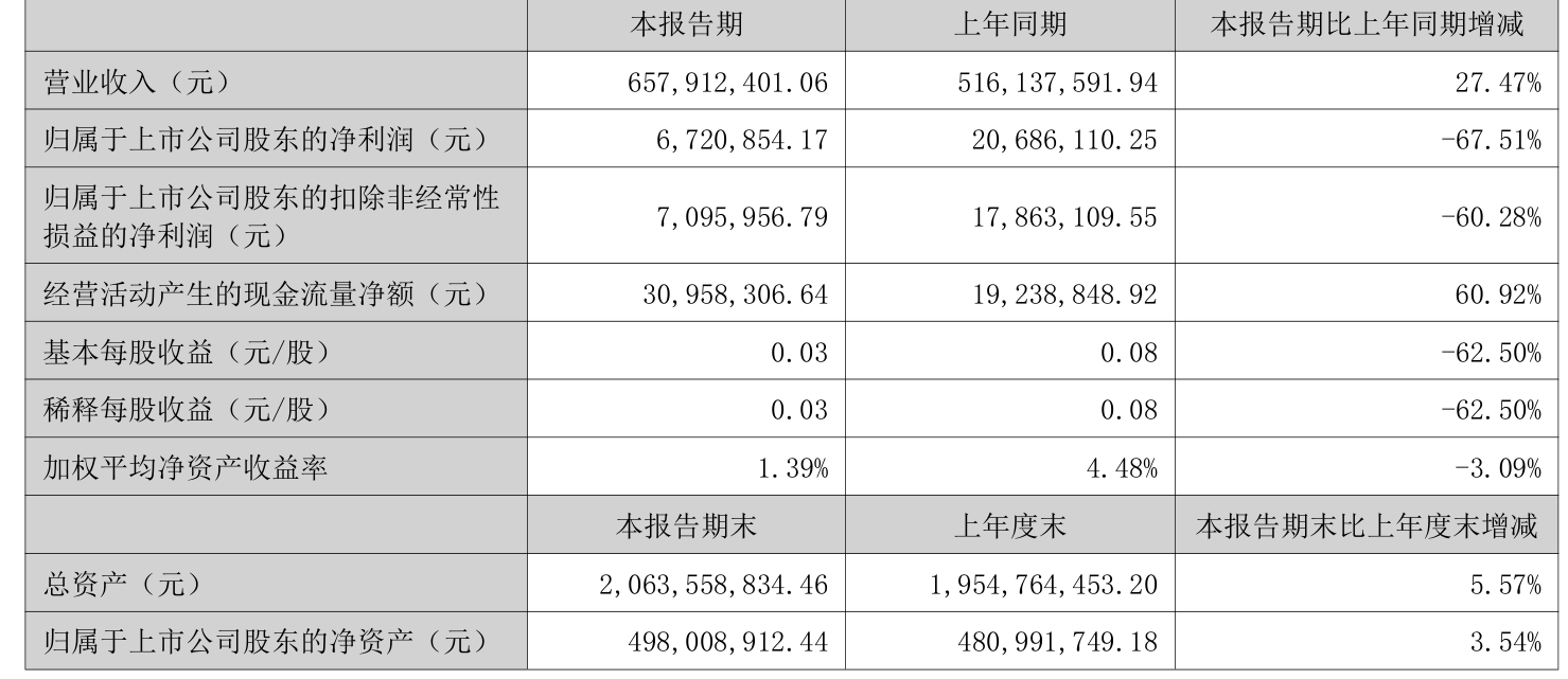 中证智能财讯天津普林(002134)8月27日披露2025年半年度报告。2025年上半年,公司实现营业总收入6.58亿元,同比增长27.47%;归母净利润672.09万元,同比下降67.51%;扣非净利润709.6万元,同比下降60.28%;经营活动产生的现金流量净额为3095.83万元,同比增长60.92%;报告期内,天津普林基本每股收益为0.03元,加权平均净资产收益率为1.39%。