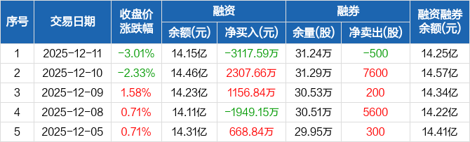 顺络电子:融资净偿还3117.59万元,融资余额14.15亿元(12-11)