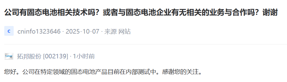 拓邦股份:在特定领域的固态电池产品目前在内部测试中