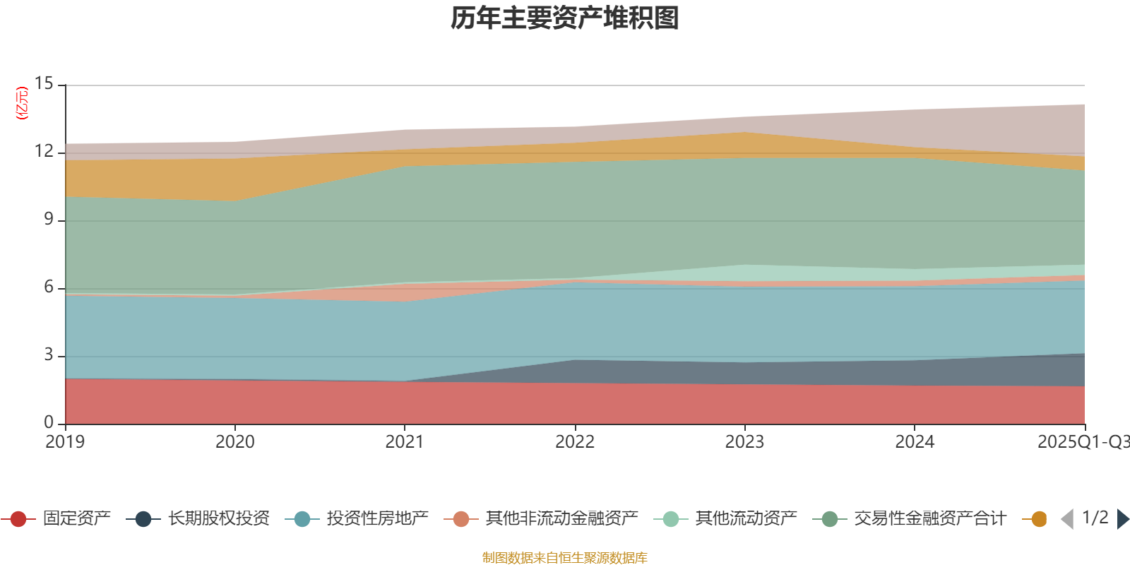 资产重大变化方面,截至2025年三季度末,公司交易性金融资产合计较上年末减少15.21%,占公司总资产比重下降5.86个百分点;应收票据及应收账款较上年末增加288.47%,占公司总资产比重上升2.95个百分点;长期股权投资较上年末增加29.83%,占公司总资产比重上升2.23个百分点;预付款项较上年末增加42.36%,占公司总资产比重上升1.41个百分点。