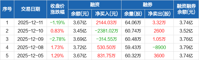 融资方面,当日融资买入5893.22万元,融资偿还3749.2万元,融资净买入2144.03万元。融券方面,融券卖出4.07万股,融券偿还7500股,融券余量64.06万股,融券余额692.54万元。融资融券余额合计3.74亿元。