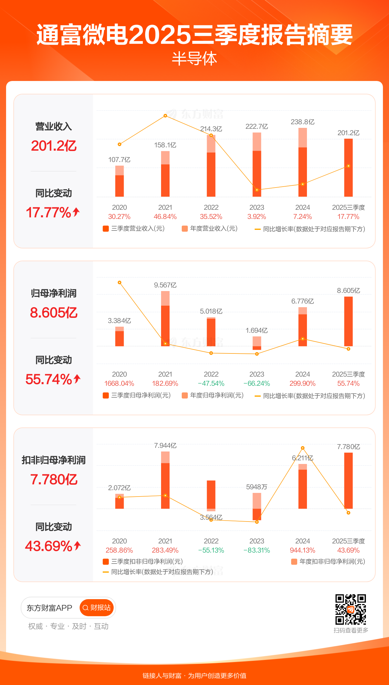 通富微电10月28日发布2025年三季报显示,公司前三季实现营业收入201.16亿元,同比增长17.77%;归母净利润8.60亿元,同比增长55.74%;扣非归母净利润7.78亿元,同比增长43.69%。