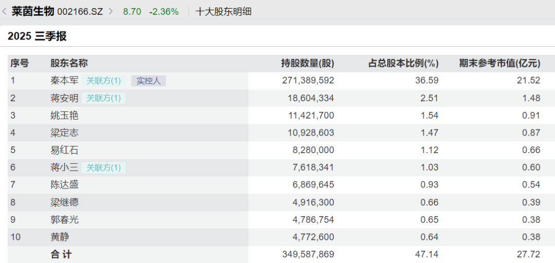 截至今年三季度末,秦本军持有莱茵生物2.71亿股,持股占比为36.59%。